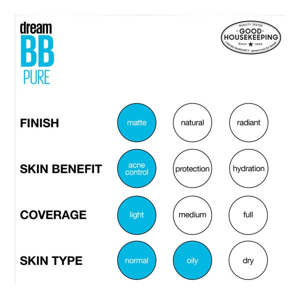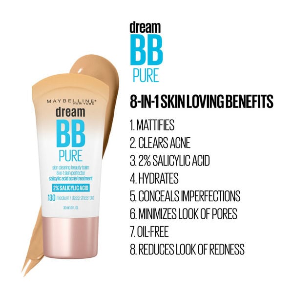 • Dream BB Pure clears acne with 2 percent salicylic acid, conceals imperfections, minimizes look of pores, reduces appearance of redness, hydrates and smoothes, mattifies and clarifies, is oil-free and available in 5 shades
