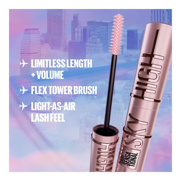 • Maybelline Lash Sensational Sky High mascara’s exclusive Flex Tower mascara brush bends to volumize and extend every single lash from root to tip