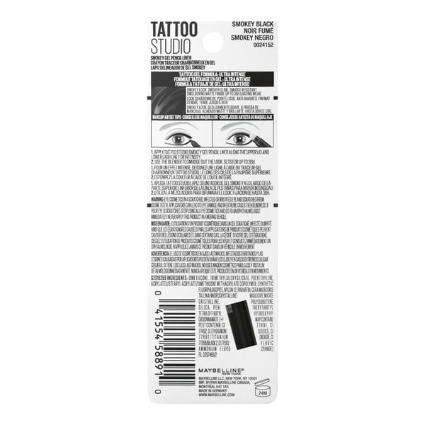 • Meet our 1st blendable mechanical gel pencil liner. Just blend and set for a smoldering smokey look. Maybelline NY’s Tattoo Studio Smokey Gel Pencil glides on smooth for a sultry blend and smoldering tattoo matte finish. This smudge proof eyeliner doesn’t smear—even in the inner line. It’s a long lasting waterproof eyeliner that’s formulated with powder in a gel, leaving behind a smokey, blurred and elegant look. Plus, it’s designed with a precision application tip for ultimate control. Now available in three shades, Smokey Black, Smokey Grey, and Smokey Brown. Ophthalmologist tested and is suitable for contact lens wearers.