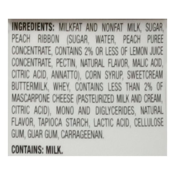 Milkfat And Nonfat Milk, Sugar, Peach Ribbon (sugar, Water, Peach Puree Concentrate, Contains 2% Or Less Of Lemon Juice Concentrate, Pectin, Natural Flavor, Malic Acid, Citric Acid, Annatto), Corn Syrup, Sweetcream Buttermilk, Whey, Contains Less Than 2% Of Mascarpone Cheese (pasteurized Milk And Cream, Citric Acid), Mono And Diglycerides, Natural Flavor, Tapioca Starch, Lactic Acid, Cellulose Gum, Guar Gum, Carrageenan.