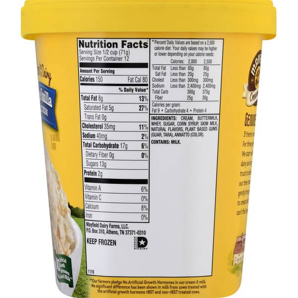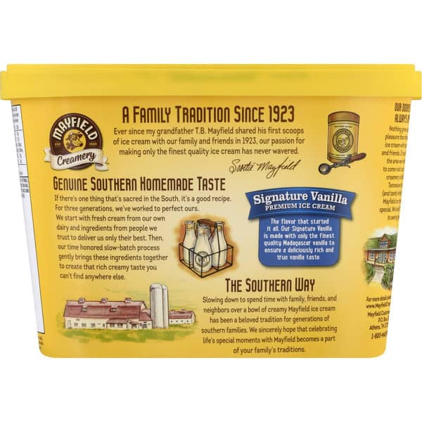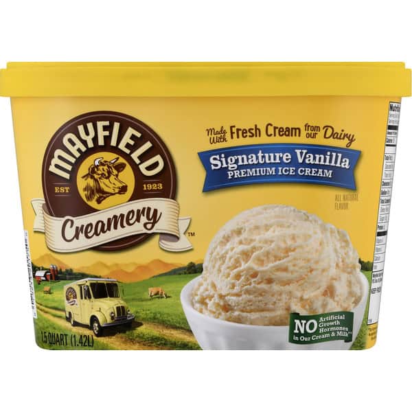 Mayfield Signature Vanilla Ice Cream is a premium ice cream so delicious that you’ll need a second scoop. With an indulgent vanilla flavor, this frozen ice cream tub comes with a perfectly creamy texture. Mayfield ice cream starts with fresh cream from our own dairy, just like when Mayfield Creamery started in 1923. Each 1.5-quart ice cream tub is perfect for sharing with family and friends. Mayfield frozen desserts are proudly inspired by family recipes that have been perfected over three generations.