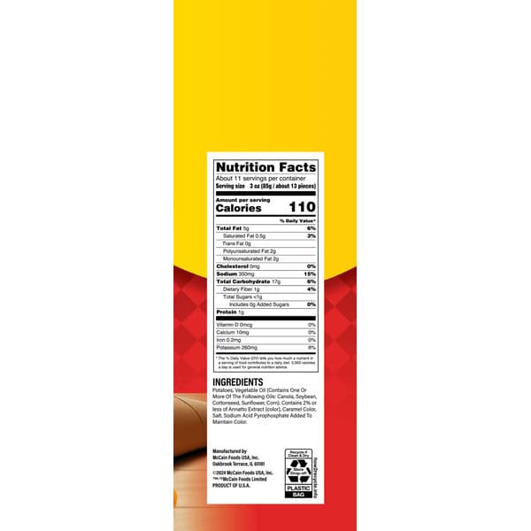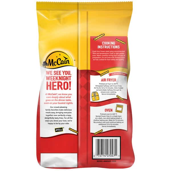 McCain Crinkle Fries are a perfect addition to your family dinner. These crispy and delicious crinkle cut fries have a yummy potato flavor that the whole family will love. Contains no artificial flavors, no synthetic colors, and made with real potatoes. Easy to make, just heat and serve with an airfryer. Try a bag today!