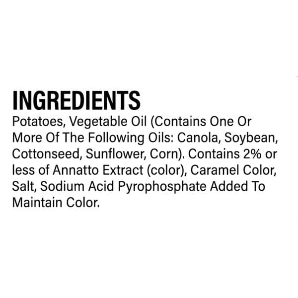 Potatoes, Vegetable Oil (contains One Or More Of The Following Oils: Canola, Soybean, Cottonseed, Sunflower Corn), Salt, Sodium Acid Pyrophosphate Added To Maintain Natural Color, Annatto & Caramel (color).