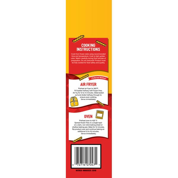 Oven Half Bag Instructions: Preheat oven to 425 degrees F. spread frozen product in a single layer on a dark, non-stck baking sheet or shallow baking pan. Bake for 12 minutes, flip product over and continue baking an additional 12 to 16 minutes. Serve immediately. Deep Fry It is recommended when using this cooking method to use non-hydrogenated liquid cooking oil): Preheat cooking oil to 350 degrees F. fill basket 1/2 full (1/2 level) with frozen product. Deep fry 3 to 3-1/2 minutes. Spread on absorbent paper. Serve immediately. Cooking Guidelines: Note: Cook to light golden color cooking times vary depending on appliance power. Watch carefully during the final minutes of preparation. Do not overcook! Product must be fully cooked for food safety and quality.