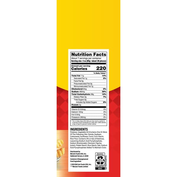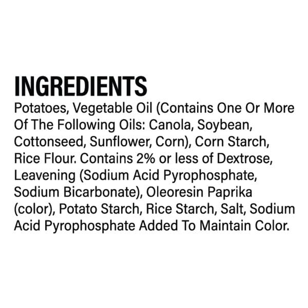 Potatoes, Vegetable Oil (contains One Or More Of The Following Oils: Canola, Soybean, Cottonseed, Sunflower, Corn), Corn Starch, Rice Flour. Contains 2% Or Less Of Dextrose, Leavening (sodium Acid Pyrophosphate, Sodium Bicarbonate), Oleoresin Paprika (color), Potato Starch, Rice Starch, Salt, Sodium Acid Pyrophosphate Added To Maintain Color.