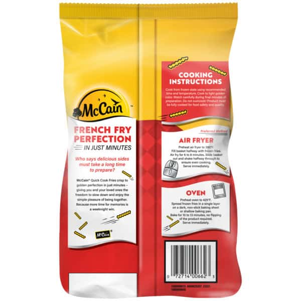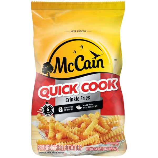 McCain Quick Cook Crinkle Fries are a perfect addition to your family dinner as an easy meal side or appetizer. These crispy and delicious crinkle cut fries have a yummy potato flavor that the whole family will love. Contains no artificial flavors, no synthetic colors, and made with real potatoes. Quick and easy to make, cook and serve in just 6 minutes with an airfryer. Try a bag today!