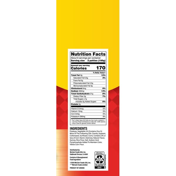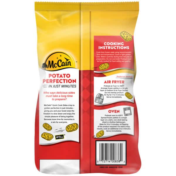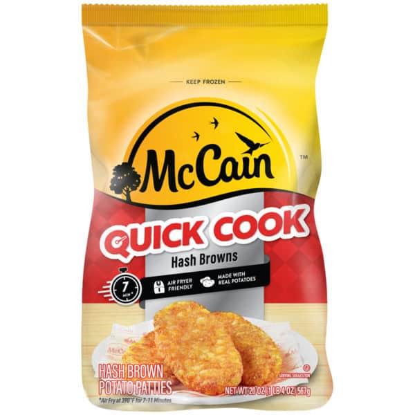 9 Minute (Oven cook time of 9-11 minutes at 425 degrees F). Air Fryer: Preheat air fryer to 390 degrees. Arrange frozen patties in a single layer on bottom of a fryer basket do not overlap product. Air fry for 7 to 11 minutes. Serve immediately. Oven: Preheat oven to 425 degrees F. Spread frozen patties in a single layer on a dark, non-stick baking sheet or shallow baking pan. Bake for 9 to 11 minutes, no flipping of the product required. For extra crispy results, cook an additional 2 – 3 minutes. Serve immediately. Quick cook Hash browns are quality potatoes that oven cook in a little as 9 minutes. No flip required! We cook them longer so you can spend less time baking and more time sharing food and memories with friends and family. Mc Cain quick coon hash browns make a perfect side dish for morning or evening. Try a bag today Cooking Guidelines: Note: Cook from frozen state using recipes time and temperature. Always cook to light color. Do not overcook! Product must be foil cooked for food safety and quality.