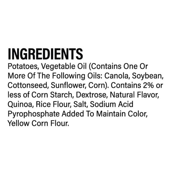 Potatoes, Vegetable Oil (contains One Or More Of The Following Oils: Canola, Soybean, Cottonseed, Sunflower, Corn). Contains 2% Or Less Of Corn Starch, Dextrose, Natural Flavor, Quinoa, Rice Flour, Salt, Sodium Acid Pyrophosphate Added To Maintain Color, Yellow Corn Flour.