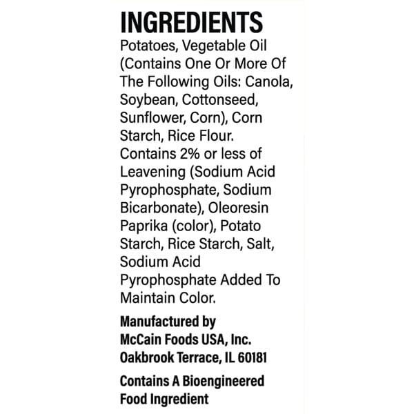 Potatoes, Vegetable Oil Contains One Or More Of The Following Oils: Canola Soybean, Cottonseed, Sunflower, Corn), Corn Starch, Rice Flour. Contains 2% Or Less Of Leavening (sodium Acid Pyrophosphate, Sodium Bicarbonate), Oleoresin Paprika (color), Potato Starch, Rice Starch, Salt, Sodium Acid Pyrophosphate Added To Maintain Color.
