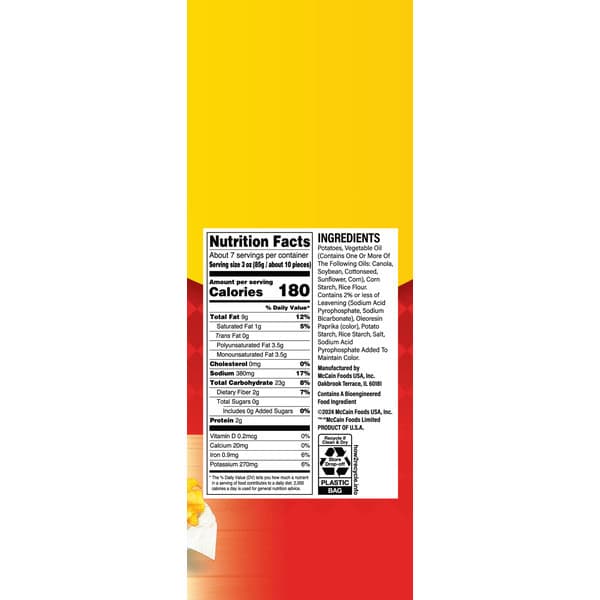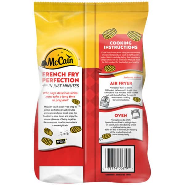 McCain Quick Cook Waffle Fries are a perfect addition to your family dinner as an easy meal side or appetizer. These crispy and delicious waffle cut fries have a yummy potato flavor that the whole family will love. Contains no artificial flavors, no synthetic colors, and made with real potatoes. Quick and easy to make, cook and serve in just 6 minutes with an airfryer. Try a bag today!