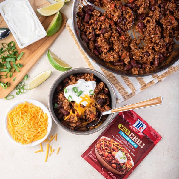 Keep McCormick 30% Less Sodium Mild Chili Seasoning Mix stocked in your pantry so you can whip up a kid-friendly, family-friendly meal any night of the week in just 20 minutes. To prepare, simply brown ground beef or turkey, add seasoning mix, canned tomatoes and kidney beans, then simmer to blend the flavors. Serve with chili toppers, like shredded cheese, sour cream, avocado and green onions. You can also use our seasoning mix in place of the spices in your favorite chili recipe.