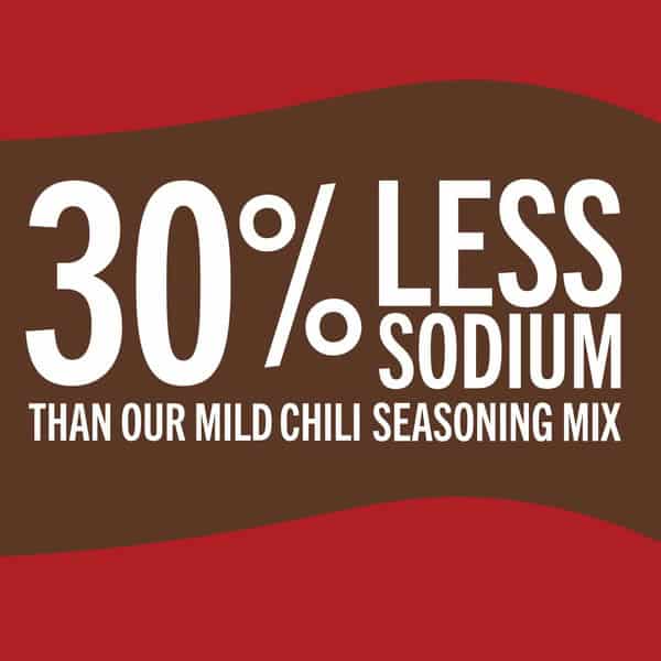 Chili night just got easier, more delicious and now with 30% less sodium than our Mild Chili Seasoning Mix! Our signature blend contains onion and garlic plus zesty McCormick spices like chili pepper, paprika, cumin, onion and garlic, with no added MSG or artificial flavors.