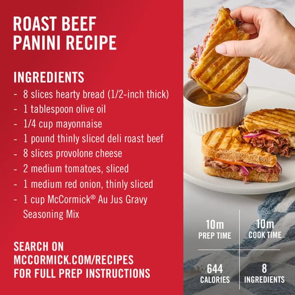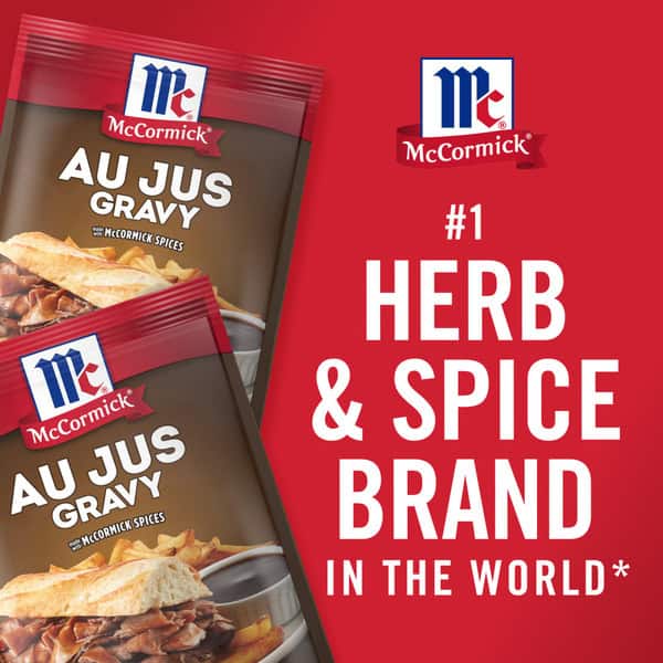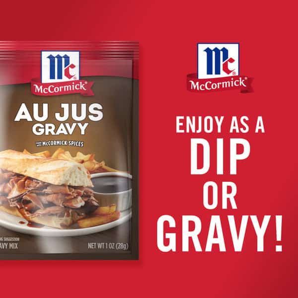 With McCormick spices, celery, and garlic, easy to prepare McCormick Au Jus Gravy Mix yields a rich sauce to accompany a variety of dishes. Serve with prime rib and roast pork or use as a dip for hot meat sandwiches. To prepare in 5 minutes, simply combine mix with 3 cups water and bring to a boil for gravy. For a thicker gravy, add 3 tablespoons flour to mix before adding in water. Customize gravy with herbs such as thyme, sage, or rosemary for a twist. Serve au jus gravy with holiday mains like prime rib and pork tenderloin or use as a flavoring base to create French Onion soup. Au jus mix makes for a wonderful pantry staple for adding rich depth of flavor to sauces and soups. Serve prepared gravy with slow-cooker pork chops, and meatballs, or use to add savory flavor to beef stew. Entertaining? Make a big batch of au jus and serve with French Dip sandwiches.