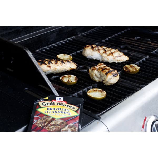All it Takes is Flame & Flavor 1/4 cup oil; 1/4 cup water; 1 tbsp. red wine vinegar; 2 lbs. beef, pork, chicken or shrimp* 1. Whisk together marinade mix, oil, water and vinegar in bowl. Reserve 2 tbsp. marinade for basting. Place meat and remaining marinade in resealable plastic bag. 2. Refrigerate 15 minutes or longer. Remove meat from marinade. Discard any remaining marinade. 3. Grill until cooked through, basting with reserved marinade during last few minutes of cooking. *Do not marinade seafood longer than 30 minutes.