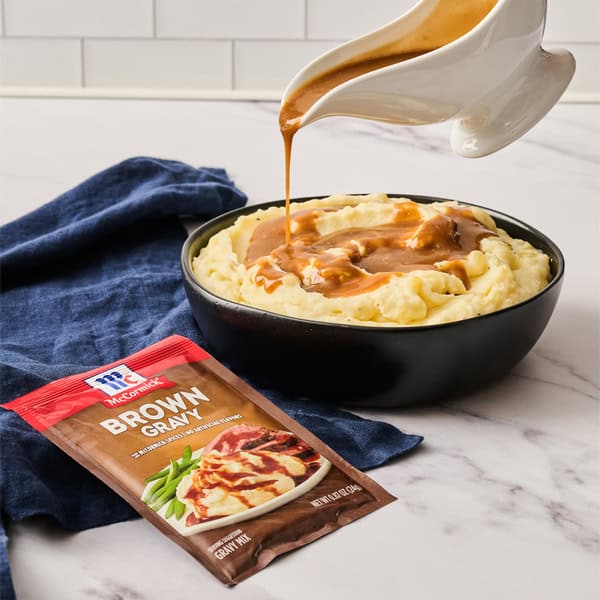 Add savory flavor to your favorite dishes with McCormick Brown Gravy Mix. Rich and indulgent, it’s the perfect go-to pantry staple for memorable holiday gravy or that special touch for weeknight meals. This convenient gravy mix comes together in five minutes in the microwave or on your stove. Simply combine with 1 cup cold water, bring to a boil, and simmer. Serve with classic sides like mashed potatoes, stuffing, and noodles, or make holiday gravy for the main event― serve alongside roast beef, roast turkey, and roast goose. Made without added MSG or artificial flavors. With an expert combination of McCormick spices, onion, and garlic, McCormick Brown Gravy Mix effortlessly yields a rich, lump-free brown gravy, but it’s also a great short-cut ingredient. Keep on hand as a meal-starter for weeknight dinners like slow-cooker stew and casserole recipes, smother fries in gravy and top with cheese curds for a crowd-pleasing appetizer or whip up a short-cut stroganoff sauce― the options are endless!