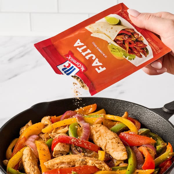 For easy, restaurant-style fajitas at home, reach for McCormick Fajitas Seasoning Mix. A vibrant combination of cumin, chili peppers, garlic, and a hint of lime juice, it infuses steak, chicken, and veggies with southwestern-inspired flavor in minutes. Whether you’re looking for a family-friendly meal or dining solo, this convenient seasoning mix is the solution. Combine one packet with one pound of meat and prepare on the stovetop. From there you can fill warm tortillas for chicken fajitas, beef fajitas, or even shrimp fajitas, and top with everything from shredded lettuce to guacamole, avocado slices, chopped tomatoes, sour cream, and salsa. Or use prepared fajita meat to prepare nachos or quesadillas for a fun twist. Welcome to the world of McCormick spices! From sweet to savory to spicy, we have all the flavors you need to elevate your next meal. With our wide variety of flavors to explore, your next favorite spice is always just around the corner.