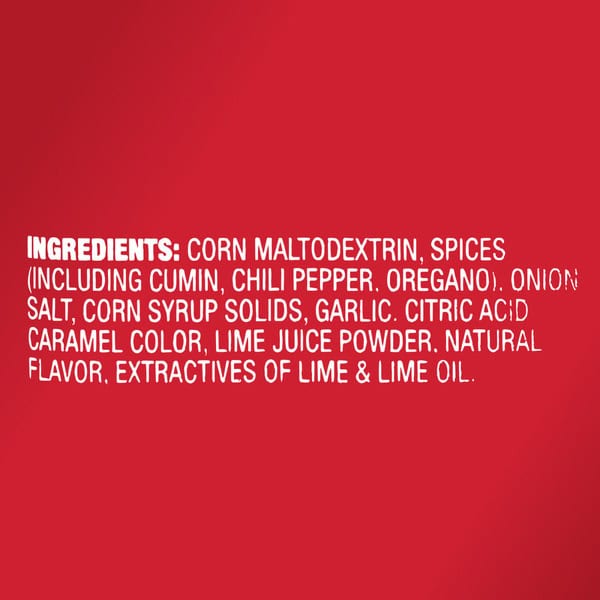 Spices (including Cumin, Chili Pepper, And Oregano), Onion, Salt, Corn Maltodextrin, Corn Syrup Solids, Garlic, Mustard Bran, Citric Acid, Caramel Color, Lime Juice Solids, Modified Corn Starch, And Natural Flavor.