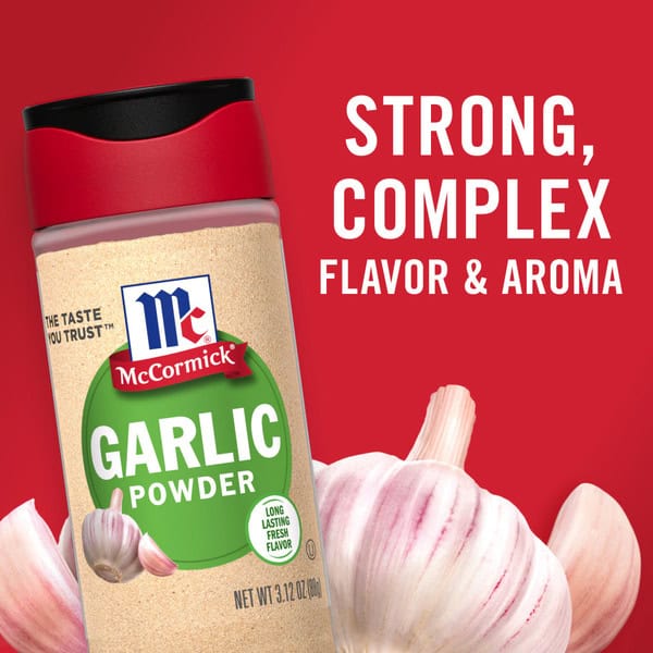 McCormick Garlic Powder is always made from fresh, whole garlic cloves that have been dried and ground for consistent, quality flavor. Every sprinkle or pour of this robust spice brings smooth, balanced warmth and savory complexity to dishes like soups, stews, stir-fries, rubs, sauces, and marinades. Skip the hassle of peeling and chopping garlic – with McCormick Garlic Powder it’s easy to bring the rich essence of this savory spice to any recipe. With its strong, complex flavor and deep aroma, garlic powder is essential to so many cuisines including Italian, Greek, Chinese, Korean, and Mexican. Any dish with ground beef – meatballs, meatloaf, chili, burgers, tacos – is a great candidate for garlic powder as well. Now in a SnapTight™ bottle to keep flavor and aroma sealed in, Garlic Powder makes meals delicious with every snap of the cap. Each bottle delivers long lasting fresh flavor, with and easy-to-find best by date. Use 1/4 tsp garlic powder in place of one clove of fresh garlic. Did you know? Powdered garlic disperses completely and evenly throughout dishes for a more consistent flavor.