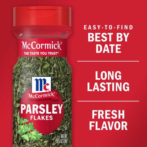 McCormick Parsley Flakes bring mild, herby flavor and attractive color to everyday dishes and holiday fare. Our Parsley Flakes are dried within hours of harvest so that they retain their characteristic parsley flavor and green color. What wouldn’t benefit from a sprinkling of parsley? It lends the perfect sprinkle of color for everything from scrambled and deviled eggs to potatoes, noodles and carrots. In addition to its use as a garnish, parsley also offers mild, herby flavor that doesn’t overpower the tastes of foods like chicken, seafood, pasta and vegetables. Add parsley flakes to seasoning blends, breading mixes, and herbed butters and sauces. Use 1 tsp. Parsley Flakes in place of 1 Tbsp. chopped fresh parsley.