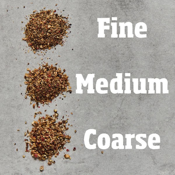 Adjust to grind: Remove cap. Pinch red tabs and turn. Coarse, medium, fine. Turn upside down and twist.