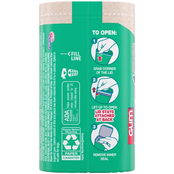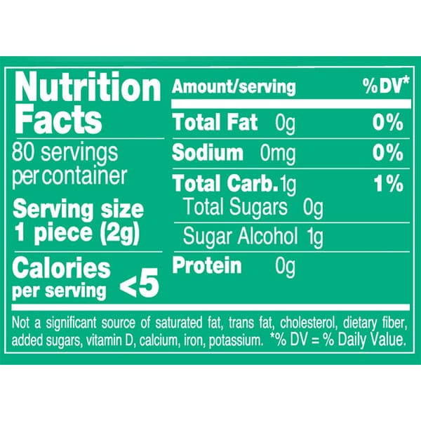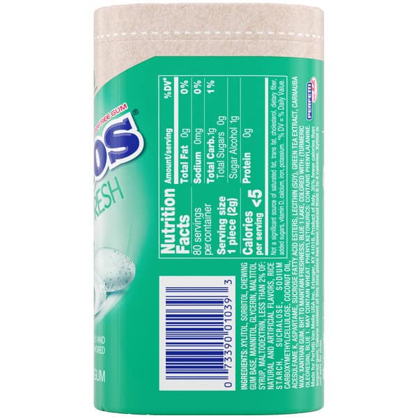 Xylitol, Sorbitol, Chewing Gum Base, Mannitol, Glycerin, Maltitol Syrup, Maltodextrin, Less Than 2% Of: Natural And Artificial Flavors, Rice Starch, Sucralose, Sodium Carboxymethylcellulose, Coconut Oil, Acesulfame K, Aspartame, Sucrose Fatty Acid Esters, Lecithin (soy), Green Tea Extract, Carnauba Wax, Xanthan Gum, Bht To Maintain Freshness, Blue 1 Lake, Colored With: (turmeric Oleoresin), Blue 1.