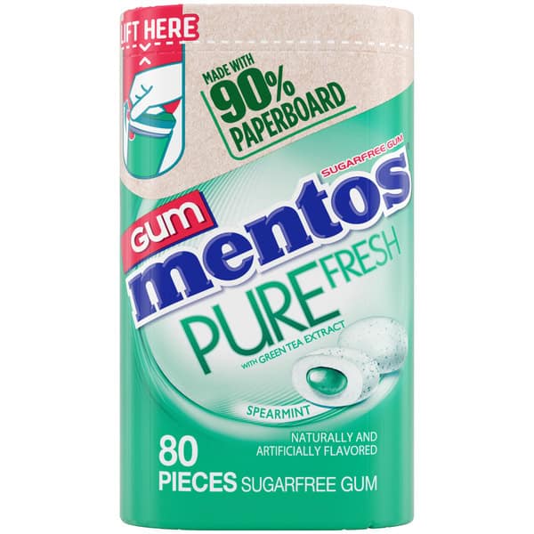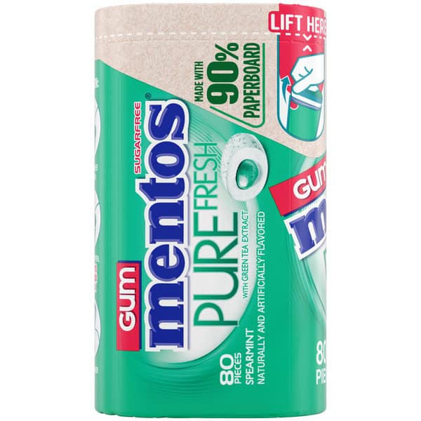 Mentos Pure Fresh Gum is now available in a certified recyclable bottle so you can have a fresh day now and recycle later. Each bottle contains 80 pieces of the Mentos Pure Fresh gum you love in a Spearmint flavor.