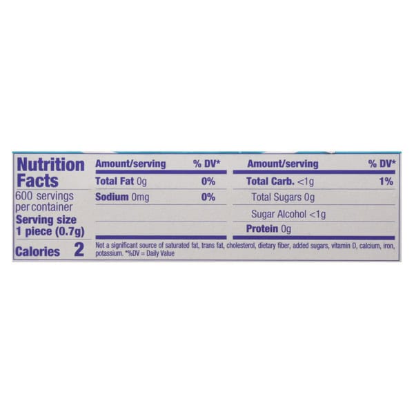 IngredientsSorbitol, Artificial Flavors, Aspartame, Magnesium Stearate, Sucralose, Green Tea Extract, Blue 1 Lake, Colored With: Riboflavin
