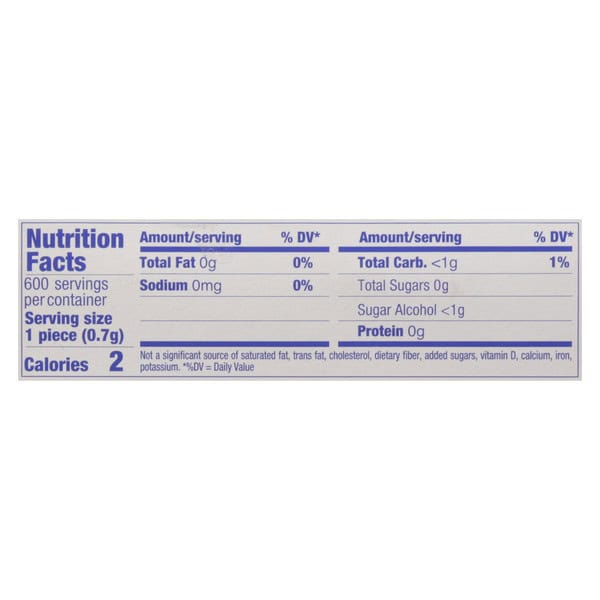 IngredientsSorbitol, Artificial Flavors, Aspartame, Magnesium Stearate, Acesulfame K, Sucralose, Green Tea Extract, Blue 1 Lake, Neotame