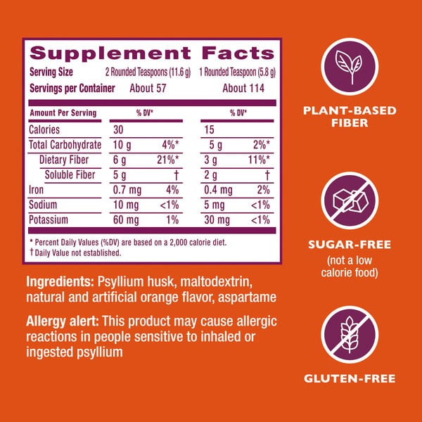 Psyllium Husk, Maltodextrin, Citric Acid, Natural And Artificial Orange Flavor, Aspartame, Yellow 6