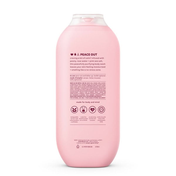 • Infused with peony, rose water + pink sea salt., • Biodegradable formula made with plant-based cleansers., • Made with no parabens, no phthalates, no bad vibes., • Leaves skin feeling moisturized + smelling scent-sational., • Bottle (minus lid) made of 65% recycled plastic (PCR)., • Cruelty free. Tested by people, not on animals.