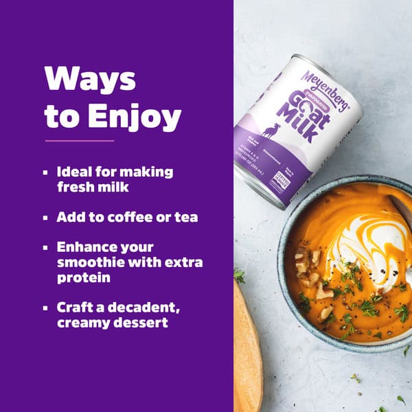 Meyenberg evaporated goat milk is perfect for cooking and baking. Certified Humane, easier to digest than cow milk. Dilute with equal parts warm water for whole milk or add directly into your favorite coffee or tea for an instant creamy flavor.