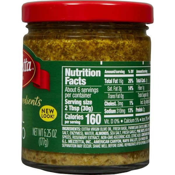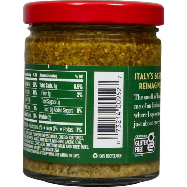Extra Virgin Olive Oil, Fresh Basil, Parmesan Cheese (milk, Cheese Cultures, Salt, Enzymes), Water, Almonds, Sea Salt, Fresh Garlic, Pine Nuts, Non-gmo Lactic Acid, Spices, Rosemary Extract, Non-gmo Ascorbic Acid, Citric Acid