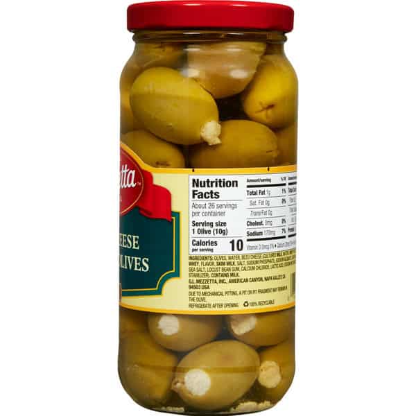 Olives, Water, Bleu Cheese (cultured Milk, Water, Whey Protein Concentrate, Cream, Whey, Flavor, Skim Milk, Salt, Sodium Phosphate, Sodium Alginate, Xanthan/guar Gum, Enzymes), Sea Salt, Calcium Chloride, Lactic Acid, Sodium Metabisulfite (added As A Color Stabilizer)
