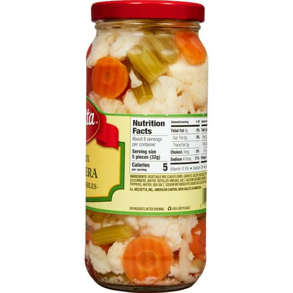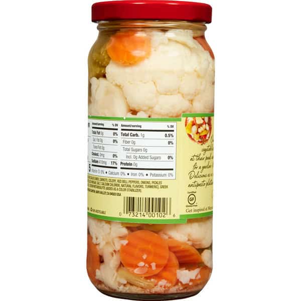 Vegetable Mix (cauliflower, Carrots, Celery, Red Bell Peppers, Onions, Pickles [cucumbers, Water, Distilled Vinegar, Salt, Calcium Chloride, Natural Flavors, Tumeric], Greek Peppers), Water, Sea Salt, Sodium Metabisulfite (added As A Color Stabilizer)
