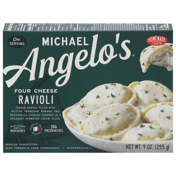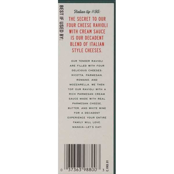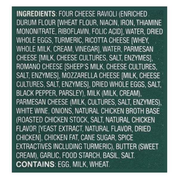 Four Cheese Ravioli (enriched Durum Flour [wheat Flour, Niacin, Iron, Thiamine Mononitrate, Riboflavin, Folic Acid], Water, Dried Whole Eggs, Turmeric, Ricotta Cheese [whey, Whole Milk, Cream, Vinegar], Water, Parmesan Cheese [milk, Cheese Cultures, Salt, Enzymes], Romano Cheese [sheep’s Milk, Cheese Cultures, Salt, Enzymes], Mozzarella Cheese [milk, Cheese Cultures, Salt, Enzymes], Dried Whole Eggs, Salt, Black Pepper, Parsley), Milk (milk, Cream), Parmesan Cheese (milk, Cultures, Salt, Enzymes), White Wine, Onions, Natural Chicken Broth Base (roasted Chicken Stock, Salt, Natural Chicken Flavor [yeast Extract, Natural Flavor, Dried Chicken], Chicken Fat, Cane Sugar, Spice Extractives Including Turmeric), Butter (sweet Cream), Garlic, Food Starch, Basil, Salt.
