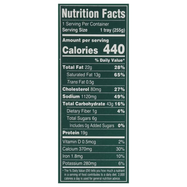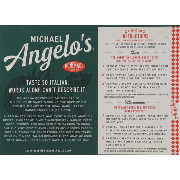 Oven: Yes, ovens take longer, but it tastes (and smells) better that way. 1. Preheat oven to 375 degrees F. Remove entree from carton. Leave film on tray, do not vent. 2. Place tray on baking sheet on the center rack of oven. Cook for 30-35 minutes. 3. Carefully remove baking sheet from oven, tray will be hot. Remove fil and let stand for 5 minutes. Caution: Product will be hot. Ovens Vary: Cooking time may need to be adjusted. Film may release during cooking. Do not use in convection oven. Microwave: Microwaves work, too. But would nonna approve? 1. Remove entree from carton. Place tray on microwave safe plate. Leave film on tray, do not vent. 2. Cook on 100% Power for 3 minutes. Lift film, stir and replace film. Cook again on 50% Power for an additional 2-3 minutes. 3. Carefully remove from microwave, tray will be hot. Remove film and let stand for 3 minutes. Caution: Product will be hot. Directions developed using an 1100 watt microwave oven; Cooking time may need to be adjusted. Film may release during cooking. Do not use in toaster oven. Cooking Instructions: Do not thaw. Keep frozen until ready to use. For safety, must be cooked to an internal temperature of 160 degrees F as measured by use of a food thermometer.