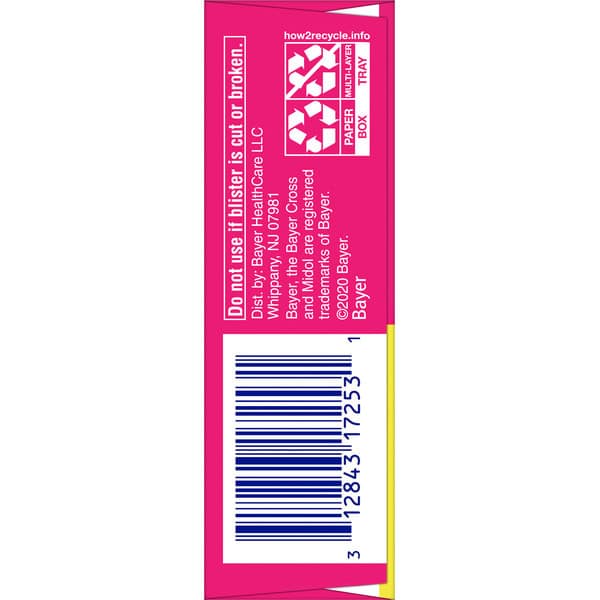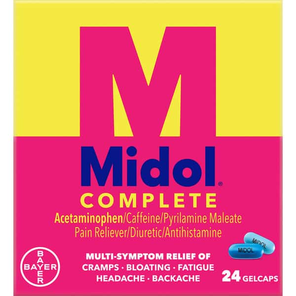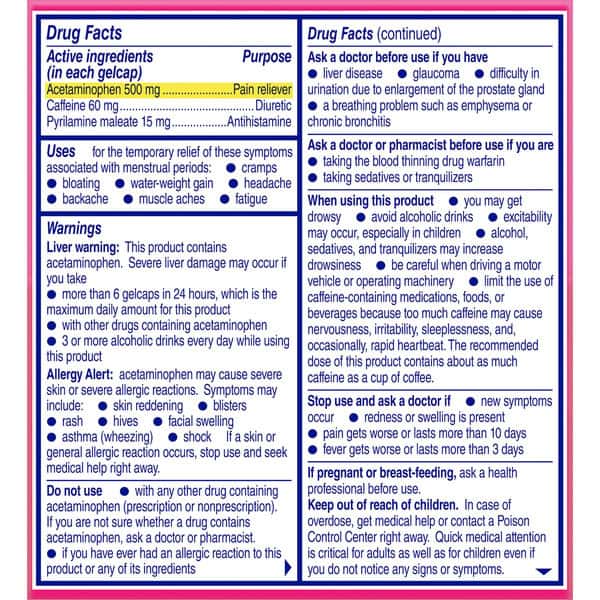 In Each Gelcap Other Information: Store at room temperature. Avoid excessive heat above 40 degrees C (104 degrees F). Acetaminophen/Pain Reliever; Caffeine/Diuretic; Pyrilamine Maleate/Antihistamine. Multi-symptom relief of cramps; bloating; fatigue; headache; backache. how2recycle.info. Questions or comments? 1-800-331-4536 (Mon-Fri 9AM – 5PM EST).
