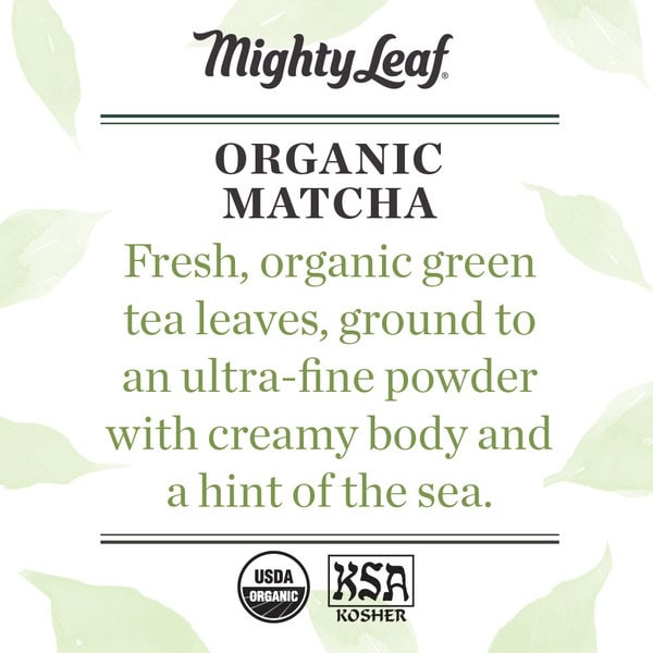 Fresh, organic Japanese green tea leaves with creamy body and a hint of the sea to inspire focus and calm. Mighty Leaf’s Matcha is expertly produced in the Shizuoaka region in Japan, where the Tencha leaves are handpicked and finely ground. Originally used in Japanese tea ceremonies, Matcha is now making its way from the traditional tea house into beverages, foods, and confections. Our organic matcha is full bodied with a slight nuttiness, a delightful umami richness and frothy texture for which Matcha is known and loved.