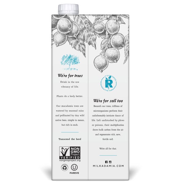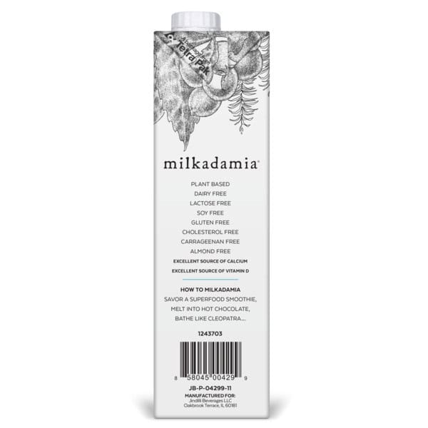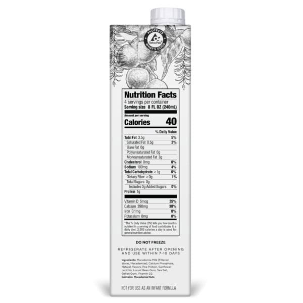 Macadamia Milk (filtered Water, Macadamias), Calcium Phosphate, Pea Protein, Natural Flavors, Sunflower Lecithin, Locust Bean Gum, Sea Salt, Gellan Gum, Vitamin A Palmitate, Vitamin D2, Vitamin B12.
