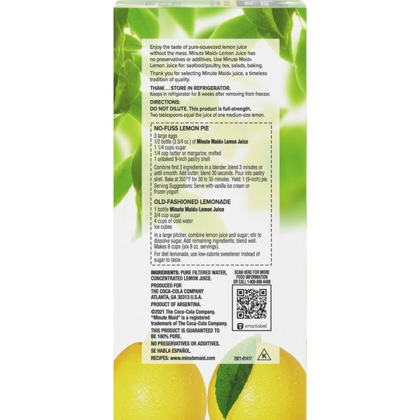 No-fuss lemon pie: 3 large eggs. 1/2 bottle (3 3/4 oz,) of minute maid lemon juice . 1 1/4 cups sugar. 1 1/4 cup butter or margarine, melted. 1 unbaked 9-inch pastry shell. Combine first 3 ingredients in a blender; blend 3 minutes or until smooth, add butter; blend 30 seconds, pour into pastry i shell, bake at 350 degrees f for 30 to 35 minutes. Yield: 1 (9-inch) pie, serving suggestions: serve with vanilla ice cream or frozen yogurt. Old-fashioned lemonade:1 bottle minute maid lemon juice . 3/4 cup sugar. 4 cups of cold water. Ice cubes. In a large pitcher, combine lemon juice and sugar; stir to dissolve sugar, add remaining ingredients; blend well, makes 6 cups (six 8 oz, servings). For diet lemonade, use low-calorie sweetener instead of sugar to taste.