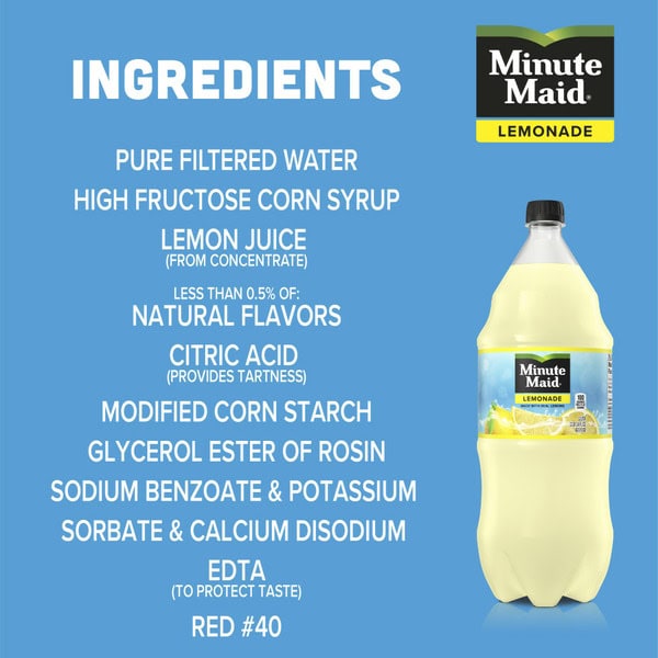 Contains Pure Filtered Water, High Fructose Corn Syrup, Lemon Juice From Concentrate, Less Than 0.5% Of: Natural Flavors, Citric Acid (provides Tartness), Modified Cornstarch, Glycerol Ester Of Rosin, Sodium Benzoate And Potassium Sorbate And Calcium Disodium Edta (to Protect Taste), Yellow #5