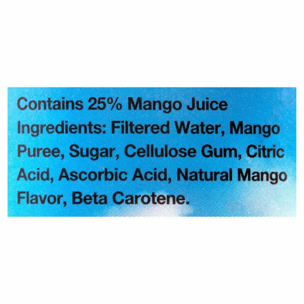 IngredientsFiltered Water, Mango Puree, Sugar, Cellulose Gum, Citric Acid, Ascorbic Acid, Natural Mango Flavor, Beta Carotene