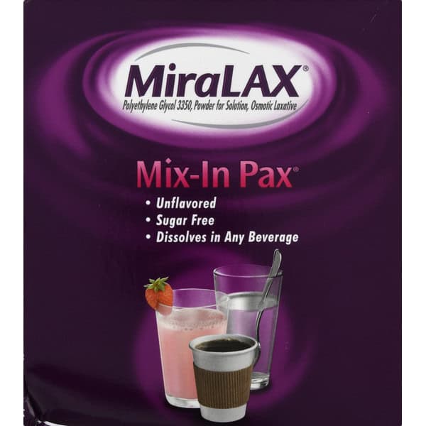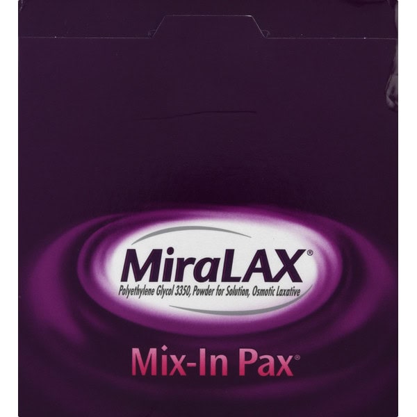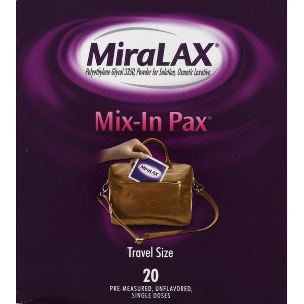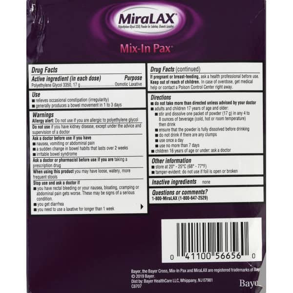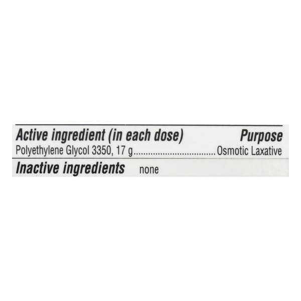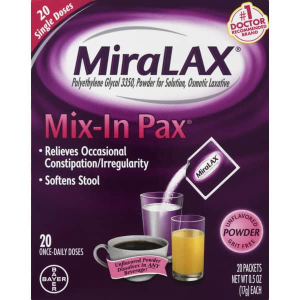 Other Information: Store at 20 degrees – 25 degrees C (68 degrees – 77 degrees F). Tamper-Evident: Do not use if foil is open or broken. Sugar free. No. 1 doctor recommended brand. Polyethylene glycol 3350, powder for solution, osmotic laxative. Relieves occasional constipation/irregularity. Softens stool. Unflavored powder grit free. 20 once-daily doses. Bayer. Unflavored power dissolves in any beverage! Unflavored. Dissolves in any beverage. Travel size 20 pre-measured, unflavored, single doses.
