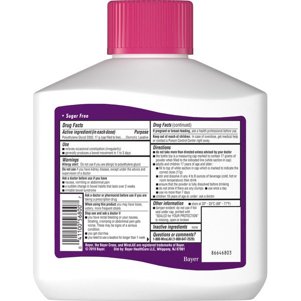 In Each Dose: Other Information: Tamper-Evident: do not use if foil seal under cap, printed with sealed for your protection is missing, open or broken. Store at 20-25 degrees C (68-77 degrees F). Unflavored powder. Sugar free. 45 once-daily doses. Value Size: Compare to 30 dose. Easy to pour bottle. Polyethylene glycol 3350, powder for solution, osmotic laxative. Relieves occasional constipation/irregularity. Softens stool. No. 1 doctor recommended brand. Measuring cap. Questions or comments? 1-800-Miralax (1-800-647-2529).