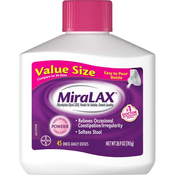 When using this product – you may have loose, watery, more frequent stools. Stop use and ask a doctor if – you have rectal bleeding or your nausea, bloating, cramping or abdominal pain gets worse. These may be signs of a serious condition. You get diarrhea, you need to use a laxative for longer than 1 week. Do not use – if you have kidney disease, except under the advice and supervision of a doctor. Ask a doctor before use if you have – nausea, vomiting or abdominal pain, a sudden change in bowel habits that lasts over 2 weeks, irritable bowel syndrome. Allergy alert: do not use if you are allergic to polyethylene glycol. If pregnant or breast-feeding, ask a health professional before use. Keep out of reach of children. – in case of overdose, get medical help or contact a poison control center right away. Ask a doctor or pharmacist before use if you are – taking a prescription drug.