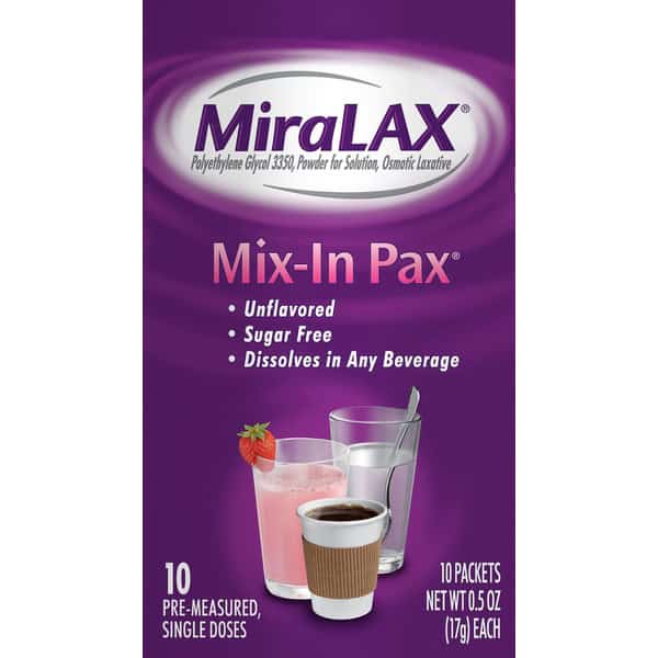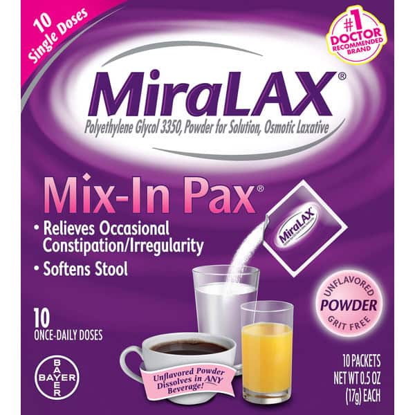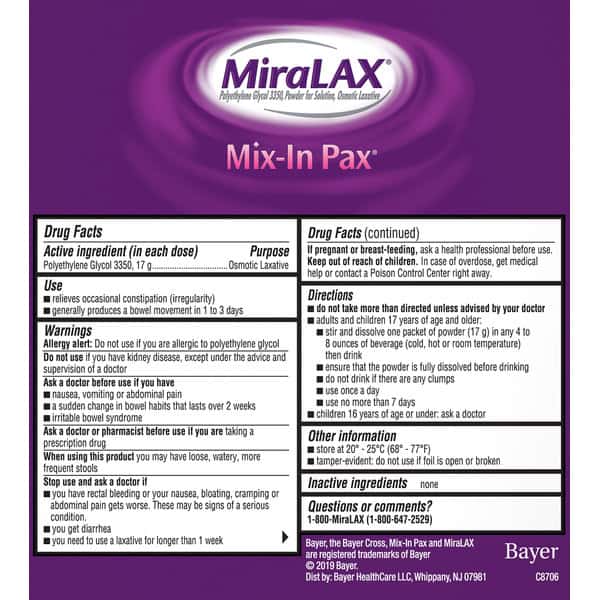 In Each Dose: Warnings: Allergy Alert: Do not use if you are allergic to polyethylene glycol. Do not use if you have kidney disease, except under the advice and supervision of a doctor. Ask a doctor before use if you have: nausea, vomiting or abdominal pain; a sudden change in bowel habits that lasts over 2 weeks; irritable bowel syndrome. Ask a doctor or pharmacist before use if you are taking a prescription drug. When using this product you may have loose, watery, more frequent stools. Stop use and ask a doctor if: you have rectal bleeding or your nausea, bloating, cramping or abdominal pain gets worse. These may be signs of a serious condition; you get diarrhea; you need to use a laxative for longer than 1 week. If pregnant or breast-feeding, ask a health professional before use. Keep out of reach of children. In case of overdose, get medical help or contact a Poison Control Center right away.