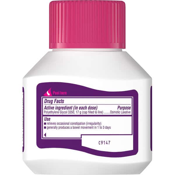 In Each Dose: Warnings: Allergy Alert: Do not use if you are allergic to polyethylene glycol. Do not use if you have kidney disease, except under the advice and supervision of a doctor. Ask a doctor before use if you have: nausea, vomiting or abdominal pain; a sudden change in bowel habits that lasts over 2 weeks; irritable bowel syndrome. Ask a doctor or pharmacist before use if you are taking a prescription drug When using this product you may have loose, watery, more frequent stools Stop use and ask a doctor if: you have rectal bleeding or your nausea, bloating, cramping or abdominal pain gets worse. These may be signs of a serious condition. ; you get diarrhea; you need to use a laxative for longer than 1 week. If pregnant or breast-feeding, ask a health professional before use. Keep out of reach of children. In case of overdose, get medical help or contact a Poison Control Center right away.