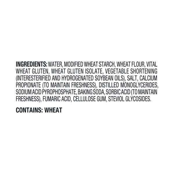 Water, Modified Wheat Starch, Enriched Bleached Flour (wheat Flour, Niacin, Reduced Iron, Thiamine Mononitrate, Riboflavin, Folic Acid), Vital Wheat Gluten, Wheat Gluten Isolate, Vegetable Shortening (interesterified And Hydrogenated Soybean Oils), Salt, Calcium Propionate (to Maintain Freshness), Distilled Monoglycerides, Sodium Acid Pyrophosphate, Baking Soda, Sorbicacid (to Maintain Freshness), Fumaric Acid, Cellulose Gum, Sucralose.