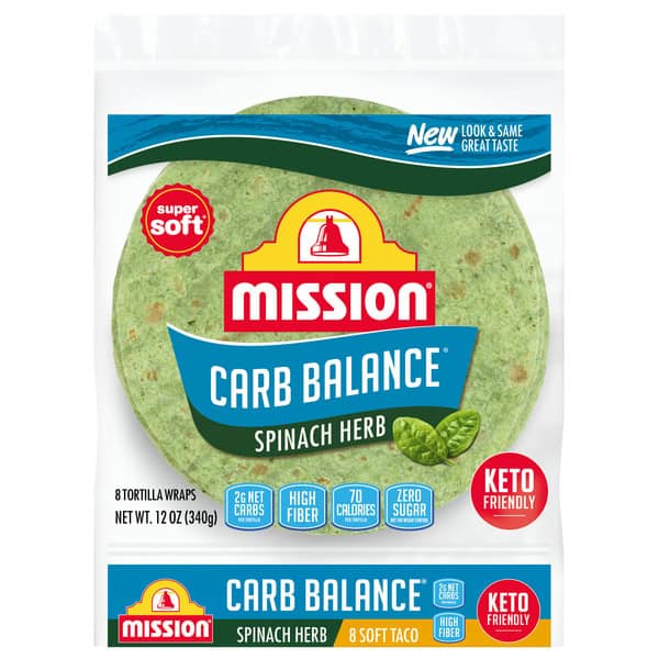 With only 3g of net carbohydrates per serving, Mission Carb Balance Spinach Herb Tortilla Wraps make it easy to ditch the carbs without sacrificing great taste. Our tortillas are packed with authentic flavor—plus the added freshness of spinach and herbs—so they’re a welcome addition to all of your favorite low carb meals. Plus, our tortillas are high in fiber, low in calories, and contain zero sugars, trans fat, or cholesterol. Layer a tortilla wrap with your favorite cold cuts, cheese, and veggies, then roll it up for an easy lunch on-the-go. Includes one 6 ct package of Mission Carb Balance Spinach Herb Tortilla Wraps.