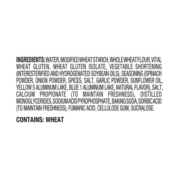 Water, Modified Wheat Starch, Whole Wheat Flour, Wheat Gluten, Vegetable Shortening (interesterified And Hydrogenated Soybean Oils) Wheat Glutenisolate, Contains 2% Or Less Of: Spinach Powder, Salt, Onion Powder, Spices, Garlic Powder, Sunflower Oil, Yellow 5 Aluminum Lake, Blue 1 Aluminum Lake, Baking Soda, Sodium Acid Pyrophosphate, Cellulose Gum, Distilled Monoglycerides, Sucralose, Fumaric Acid, And Calcium Propionate And Sorbic Acid (to Maintain Freshness).